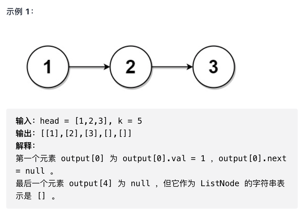 /** * Definition for singly-linked list. * struct ListNode { * int val; * ListNode *next; * ListNode() : val(0), next(nullptr) {} * ListNode(int x) : val(x), next(nullptr) {} * ListNode(int x, ListNode *next) : val(x), next(next) {} * }; */ class Solution { public: int getlistlen(ListNode* head){ int n = 0; if(head==NULL) return n; while(head){ n++; head = head->next; } return n; } vector<ListNode*> splitListToParts(ListNode* head, int k) { vector<ListNode*> res; int len = getlistlen(head); // cout<<"len:"<<len<<endl; int n = len/k; int m = len%k; vector<int> lenlist(k,n); // 初始化有k个段落,每个段落的长度为n for(int i = 0; i < m; i++) // 将多余的平均分配到前面的每个段落上面 lenlist[i]++; for(auto i:lenlist) cout<<i<<endl; ListNode* p = head; // p设为每个段落的起点 ListNode* q = head; // q遍历数组 int i = 0; while(i<lenlist.size()){ int cnt = 1; while(cnt<lenlist[i]&&q){ q = q->next; cnt++; } ListNode* tmp = q; // 保存每个段落的最后一个节点,将末尾指向NULL if(q!=NULL) q = q->next; // 将q指向下一个段落的信起点 if(tmp!=NULL) tmp->next = NULL; res.push_back(p); // 将段落的加入 p = q; // 更新下一个段落的起点 i++; // 更新下一个数组的长度 } return res; } };
