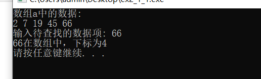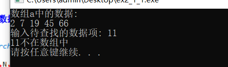 // 练习:使用二分查找,在一组有序元素中查找数据项 // 形参是数组,实参是数组名 #include <stdio.h> #include <stdlib.h> const int N=5; int binarySearch(int x[], int n, int item); // 函数声明 int main() { int a[N]={2,7,19,45,66}; int i,index, key; printf("数组a中的数据:\n"); for(i=0;i<N;i++) printf("%d ",a[i]); printf("\n"); printf("输入待查找的数据项: "); scanf("%d", &key); // 调用函数binarySearch()在数组a中查找指定数据项item,并返回查找结果给index // 补足代码① index=binarySearch(a,N,key); if(index>=0) printf("%d在数组中,下标为%d\n", key, index); else printf("%d不在数组中\n", key); system("pause"); return 0; } //函数功能描述: //使用二分查找算法在数组x中查找特定值item,数组x大小为n // 如果找到,返回其下标 // 如果没找到,返回-1 int binarySearch(int x[], int n, int item) { int low, high, mid; low = 0; high = n-1; while(low <= high) { mid = (low+high)/2; if (item == x[mid]) return mid; else if(item<x[mid]) high = mid - 1; else low = mid + 1; } return -1; }
