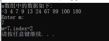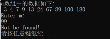 /* N个字典序的整数已放在一维数组中,给定下列程序中,函数fun的功能是: 利用折半查找算法查找整数m在数组中的位置。 若找到,则返回其下标值;反之,则返回-1 */ #include <stdio.h> #include <stdlib.h> #define N 10 int fun(int *a,int m) { int low = 0, high = N-1, mid; /*************ERROR**************/ while(low <= high) { mid = (low+high)/2; /*************ERROR**************/ if(m < *(a+mid)) high = mid-1; /*************ERROR**************/ else if(m > *(a+mid)) low = mid+1; else return(mid); } return(-1); } int main() { int i,a[N]={-3,4,7,9,13,24,67,89,100,180},k,m; printf("a数组中的数据如下:\n"); for(i=0;i<N;i++) printf("%d ",a[i]); printf("\nEnter m: \n"); scanf("%d",&m); /*************ERROR**************/ k = fun(a,m); if (k>=0) printf("m=%d,index=%d\n",m,k); else printf("Not be found!\n"); system("pause"); return 0; }