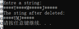 /* 假定输入的字符串中只包含字母和*号。 编写函数,实现: 除了字符串前导的*号之外,将串中其他*号全部删除。 在编写函数时,不得使用C语言提供的字符串函数。 例如,若字符串中的内容为****A*BC*DEF*G******* 删除后,字符串中的内容则应当是****ABCDEFG */ #include <string.h> #include <stdio.h> #include <stdlib.h> void fun(char *a) { /*****ERROR********/ int i=0; char *p = a; /****ERROR***/ while(*p && *p == '*') { a[i] = *p; i++; p++; } while(*p) { /******ERROR*******/ if(*p != '*') { a[i] = *p; i++; } p++; } /******ERROR*******/ a[i] = '\0'; } int main() { char s[81]; printf("Enter a string :\n"); gets(s); /***ERROR******/ fun(s); printf("The string after deleted:\n"); puts(s); system("pause"); return 0; }
