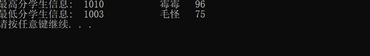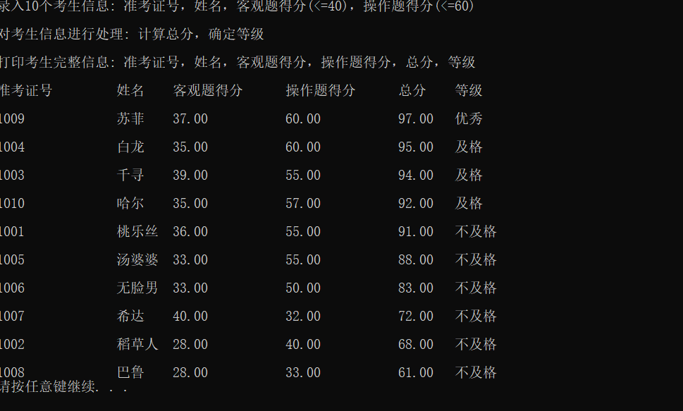 #include <stdio.h> #include <stdlib.h> #include <string.h> const int N = 10; // 定义结构体类型struct student,并定义其别名为STU typedef struct student { long int id; char name[20]; float objective; /*客观题得分*/ float subjective; /*操作题得分*/ float sum; char level[10]; }STU; // 函数声明 void input(STU s[], int n); void output(STU s[], int n); void process(STU s[], int n); int main() { STU stu[N]; printf("录入%d个考生信息: 准考证号,姓名,客观题得分(<=40),操作题得分(<=60)\n", N); input(stu, N); printf("\n对考生信息进行处理: 计算总分,确定等级\n"); process(stu, N); printf("\n打印考生完整信息: 准考证号,姓名,客观题得分,操作题得分,总分,等级\n"); output(stu, N); system("pause"); return 0; } // 从文本文件examinee.txt读入考生信息:准考证号,姓名,客观题得分,操作题得分 void input(STU s[], int n) { int i; FILE *fin; if((fin=fopen("examinee.txt","r"))==NULL) {printf("cannot find file\n"); exit(0); } for(i=0;i<N;i++) { fscanf(fin,"%ld %s %f %f",&s[i].id,s[i].name,&s[i].objective,&s[i].subjective); } fclose(fin); } // 输出考生完整信息: 准考证号,姓名,客观题得分,操作题得分,总分,等级 // 不仅输出到屏幕上,还写到文本文件result.txt中 void output(STU s[], int n) { FILE*fout; if((fout=fopen("result.txt","w"))==NULL) {printf("cannot find file\n"); exit(0); } int i; printf("\n准考证号\t 姓名\t 客观题得分\t 操作题得分\t 总分\t 等级\n"); for(i=0;i<N;i++) { printf("\n%ld\t\t %s\t %.2f\t\t %.2f\t\t %.2f\t %s\n",s[i].id,s[i].name,s[i].objective,s[i].subjective,s[i].sum,s[i].level); fprintf(fout,"\n%ld\t\t %s\t %.2f\t\t %.2f\t\t %.2f\t %s\n",s[i].id,s[i].name,s[i].objective,s[i].subjective,s[i].sum,s[i].level); } fclose(fout); } // 对考生信息进行处理:计算总分,排序,确定等级 void process(STU s[], int n) { int i,j; STU p; for(i=0;i<N;i++) { s[i].sum=s[i].subjective+s[i].objective; } for(i=0;i<N;i++) for(j=0;j<N-i-1;j++) if(s[j].sum<s[j+1].sum) { p=s[j]; s[j]=s[j+1]; s[j+1]=p; } for(i=0;i<N;i++) { if(i<n/10) strcpy(s[i].level,"优秀"); else if(i>=4*n/10) strcpy(s[i].level,"不及格"); else strcpy(s[i].level,"及格"); } }