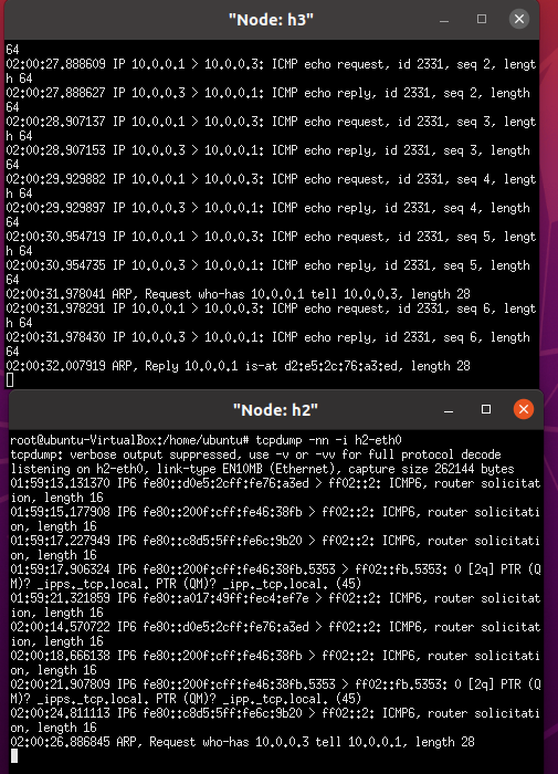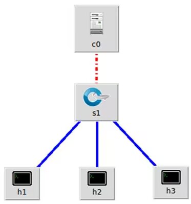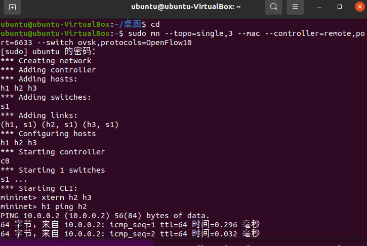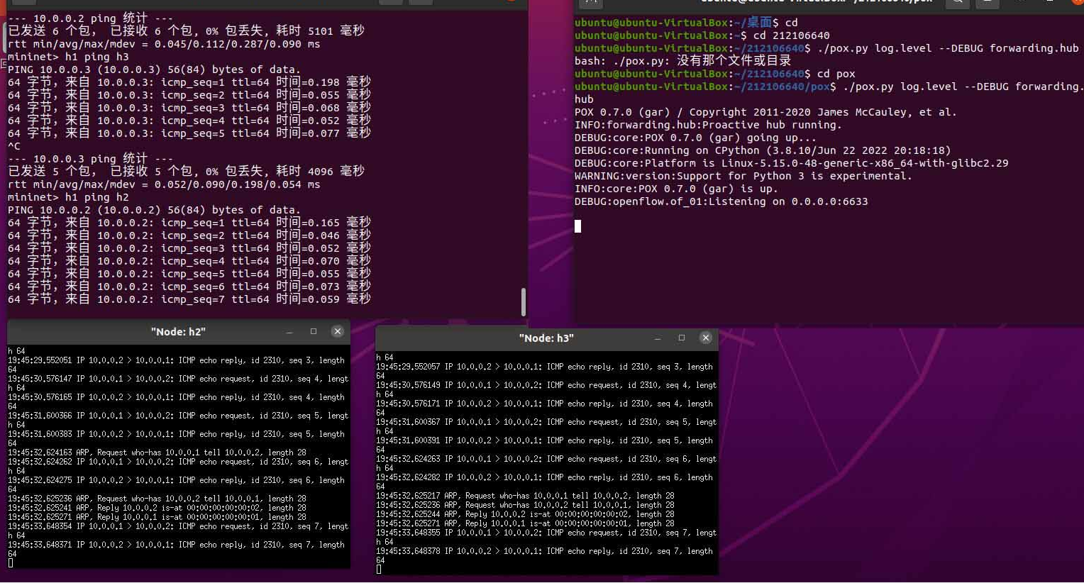 搭建下图所示SDN拓扑,协议使用Open Flow 1.0,控制器使用部署于本地的POX(默认监听6633端口)