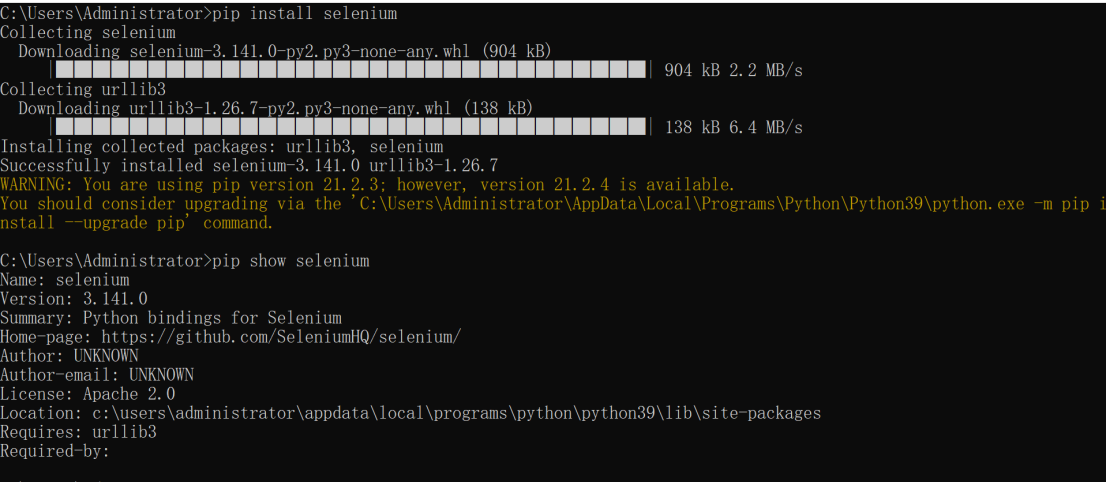 安装成功后验证输入:pip show selenium