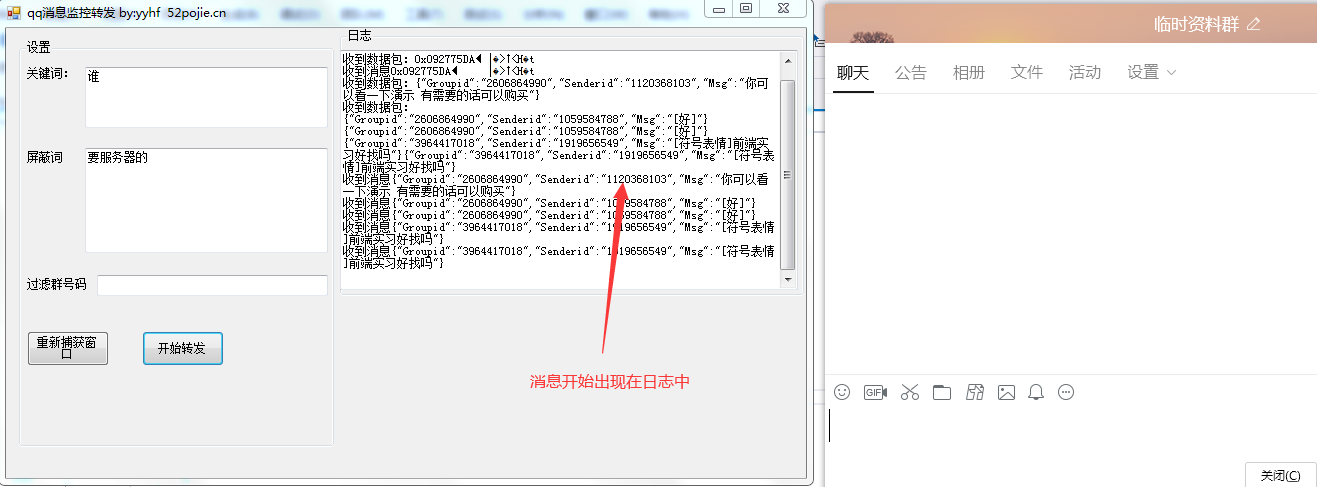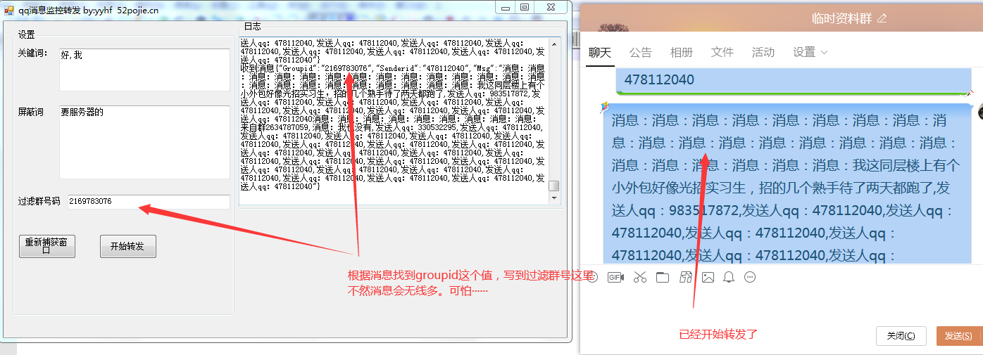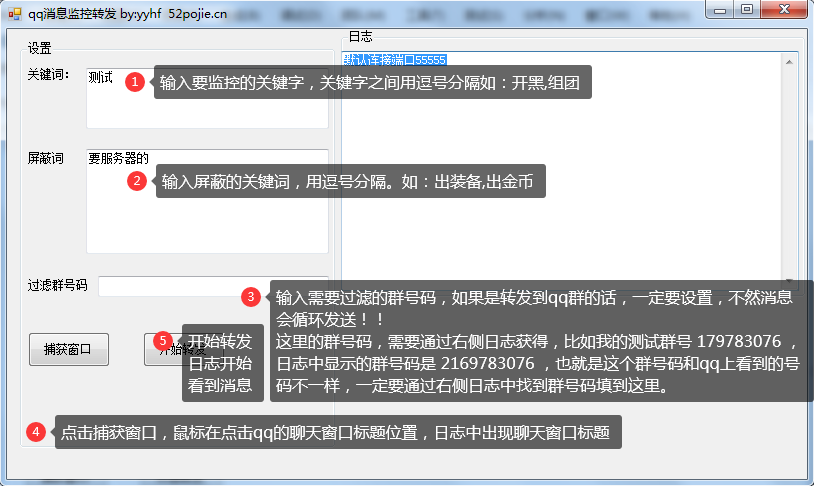 这是一个用于监控qq群消息的小软件,适合群比较多的管理员使用,使用说明见图片吧,支持关键词检测,屏蔽词检测