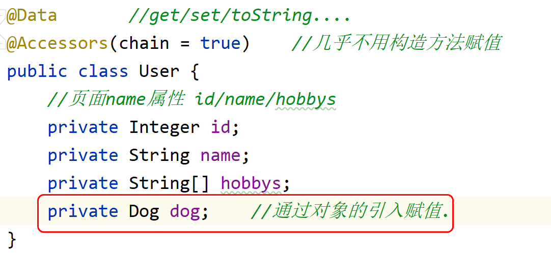 - 利用对象的引入赋值 name="二郎神"/ dog.name="哮天犬"