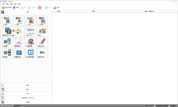 格式工厂是一款万能的多媒体格式转换器,你可以在格式工厂中文版界面的左侧列表中看到软件提供的主要功能,如视频转换、音频转换、图片转换、DVD/CD/ISO转换,以及视频合并、音频合并、混流等高级功能。