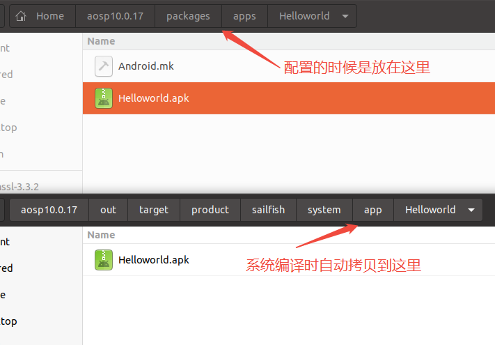 如果更新了apk后再次编译的时候无效的话,可以先手动删除out/target/product/.../Helloworld.apk文件 ,同时删除out/target/product/sailfish/obj/APPS/Helloworld_intermediates文件夹