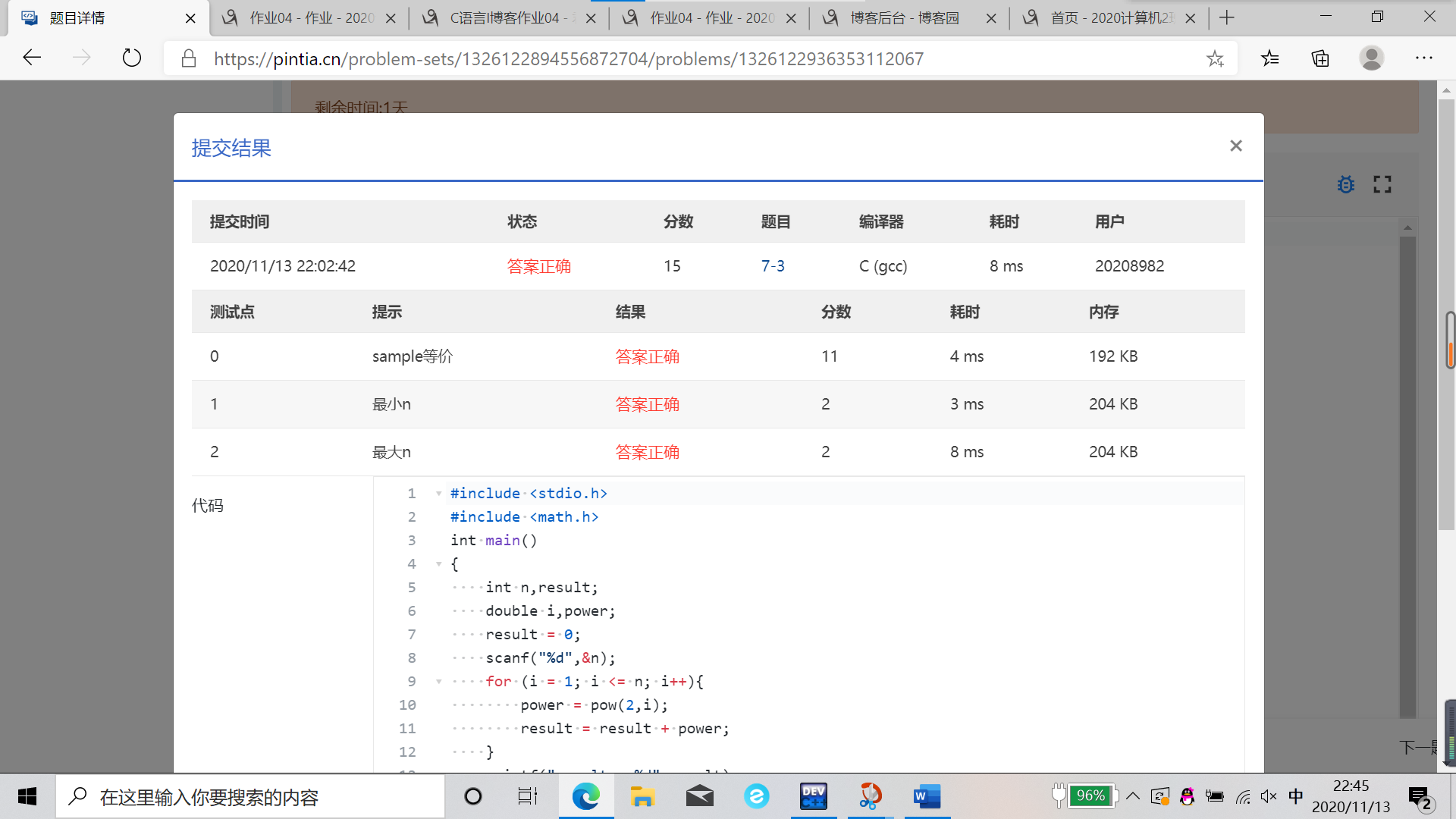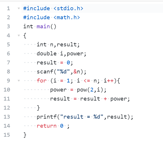 数据表达:用了n,result,i,power这些变量,变量通过定义赋值而来,类型是整数型和浮点型