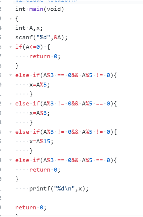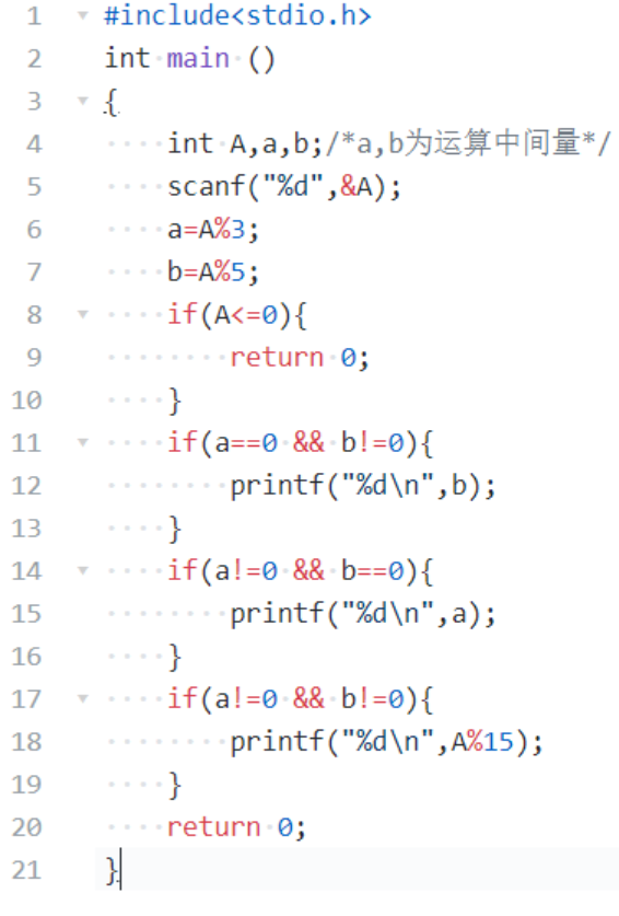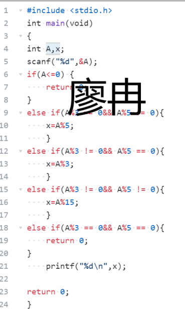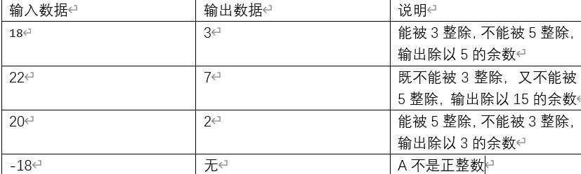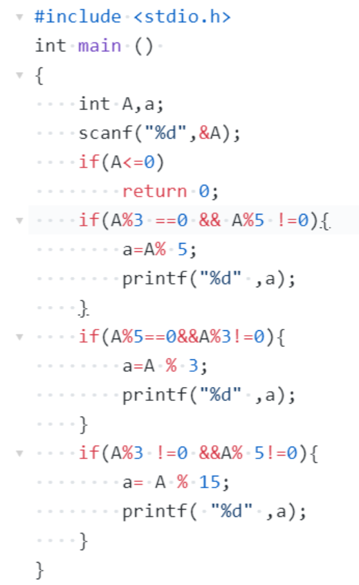 键盘输入1个正的整数A,如果A是3的倍数但不是5的倍数,则输出A除以5的余数。如果A是5的倍数但是不是3的倍数,则输出A除以3的余数。如果A既不是5的倍数但也不是3的倍数,输出A除以15的余数