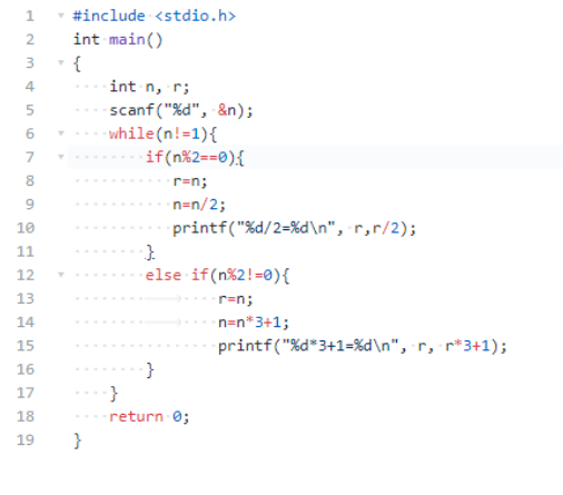日本数学家古角静夫研究自然数时,发现一个有趣现象:“如果是个偶数就除2,如果是奇数就乘以3加1”,经过有限个这样的处理步骤,最后一定能得到1. 任意输入一个自然数,给出得到结果1的运算过程。