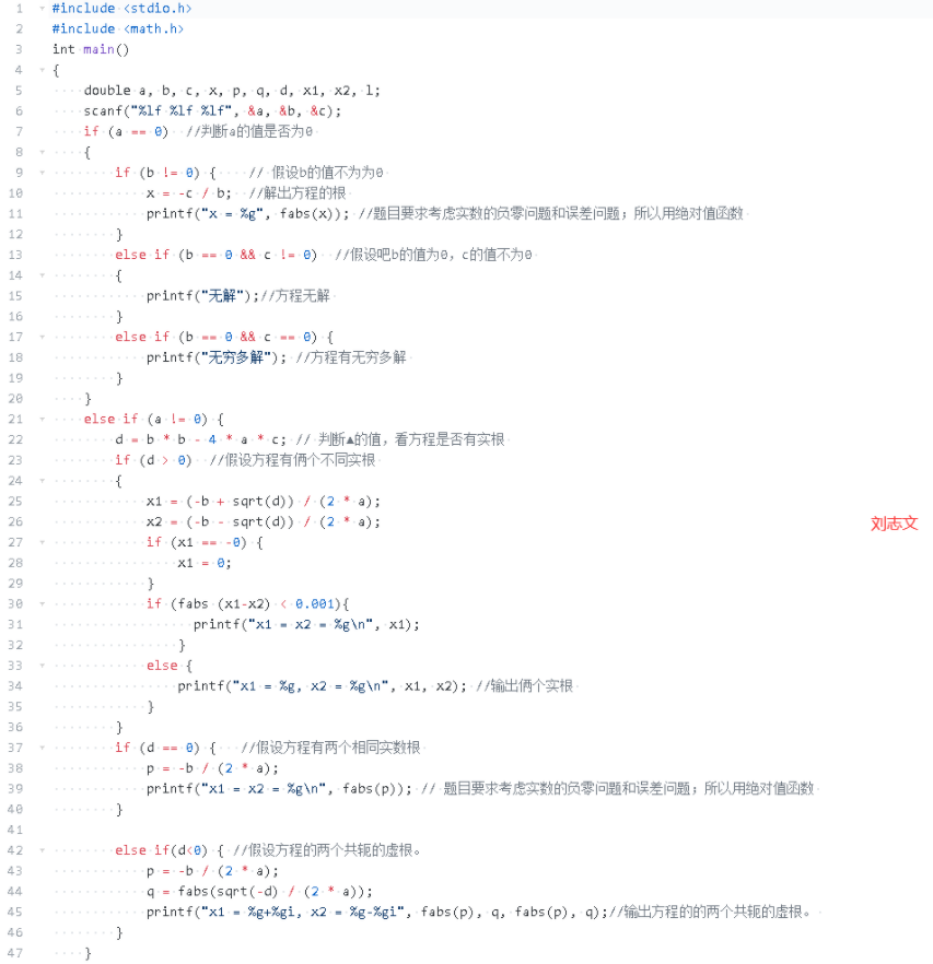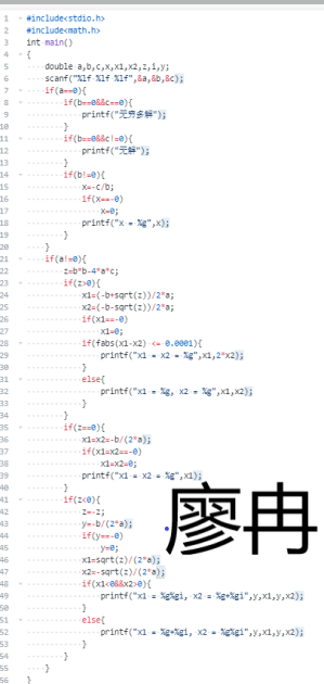 数据表达:用了a,b,c,x,x1,x2,z,i,y这些变量,这些变量通过定义赋值而来,这些变量都属于浮点型