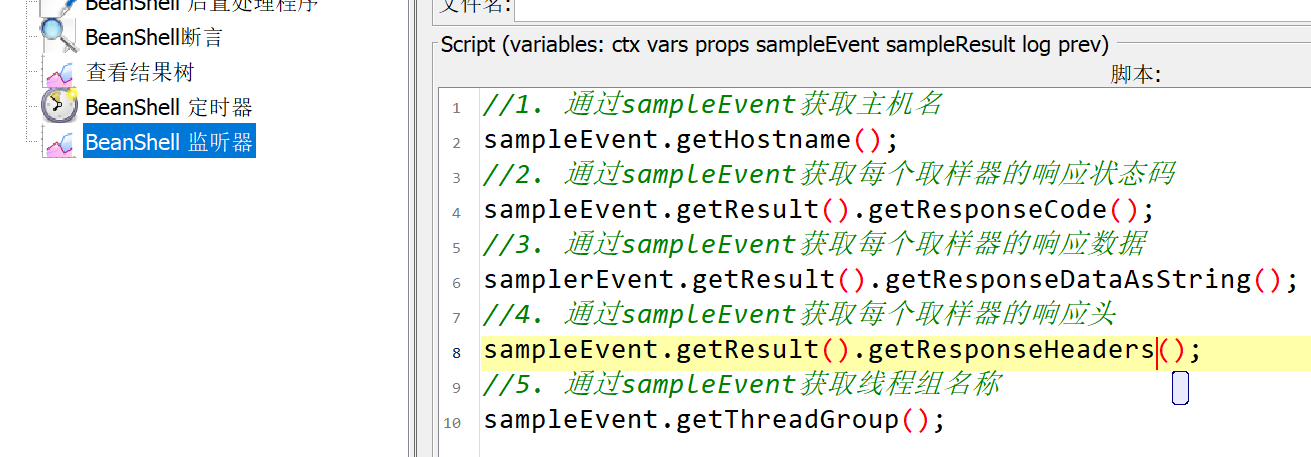 作用类似于JMeter监听器,ctx、vars、props、prev、log都和BeanShell Sampler一样
