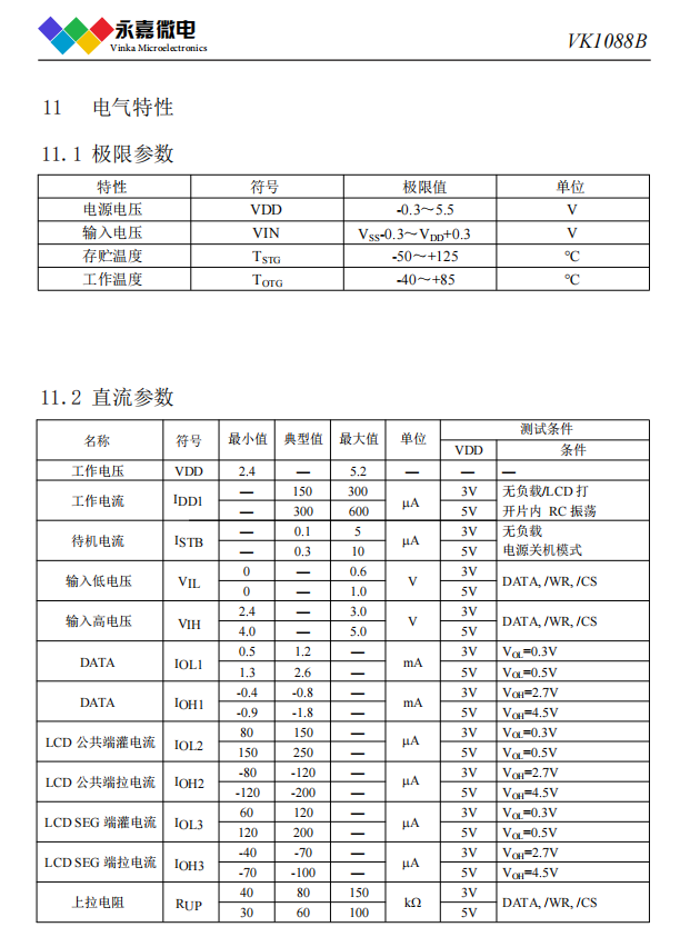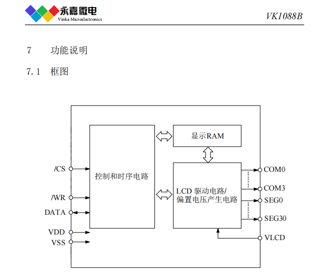 VK1088B是一个点阵式存储映射的LCD驱动器,可支持最大88点(22SEGx4COM) 的LCD屏,也支持2COM和3COM的LCD屏。单片机可通过三条通信线配置显示参数和发送显 示数据,也可通过指令进入省电模式。LJQ4133