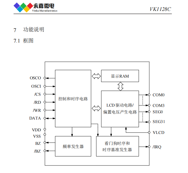 VK1128C是一个点阵式存储映射的LCD驱动器,可支持最大 128点(32SEG×4COM)的LCD屏,也支持2COM和3COM的 LCD屏。单片机可通过3/4个通信脚配置显示参数和发送显示 数据,也可通过指令进入省电模式。LJQ4157