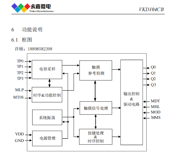VKD104CB是4通道触摸检测芯片,功耗低、工作电压范围宽以及稳定的触摸检测效果可以广泛的满足不同应用的需求,此触摸检测芯片是专为取代传统按键而设计,内建稳压电路,提供稳定电压给触摸检测电路使用,触摸检测PAD的大小可依不同的灵敏度设计在合理的范围内。该芯片具有较高的集成度,仅需极少的外部组件便可实现触摸按键的检测。上电时可通过IO脚选择4路输出的参数:输出电平,输出模式,输出脚结构;上电时也可通过IO脚选择是否使能待机模式和长按16S复位功能以及选择触摸单键/多键模式。芯片内部采用特殊的集成电路,具有高电源电压抑制比,可减少按键检测错误的发生,此特性保证在不利环境条件的应用中芯片仍具有很高的可靠性。LJQ4811