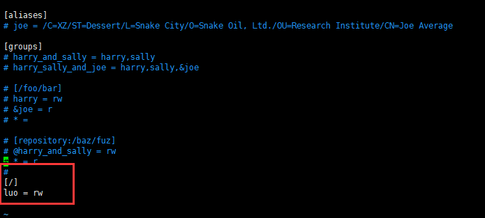 1.编辑 authz 文件(注意:[/]也是必须的)