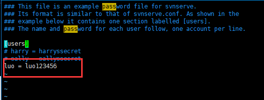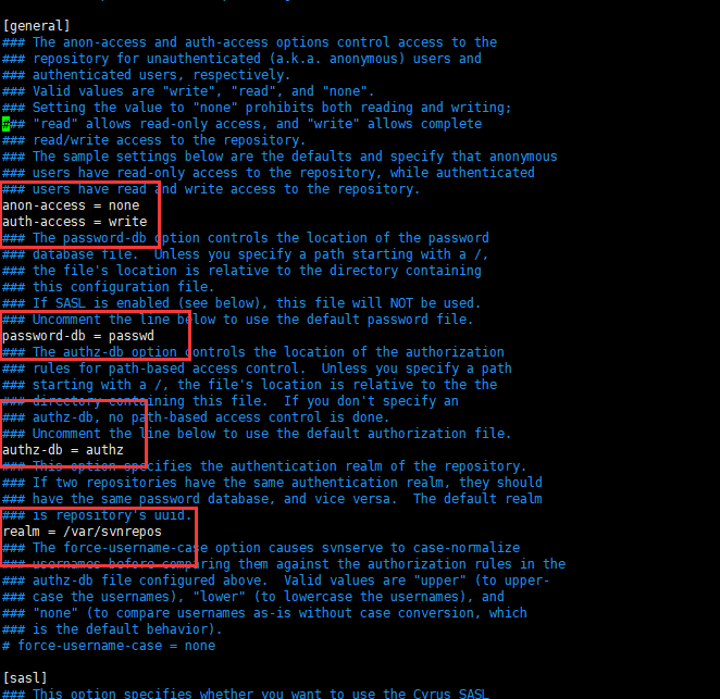 3.编辑 svnserve.conf 文件(注意:配置的前面不能有空格,一定要顶格写)