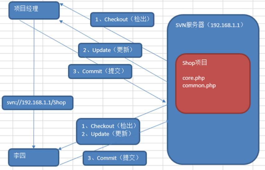 这就是经典的svn工作流程,从流程上看,有不少缺点,但也有优点。