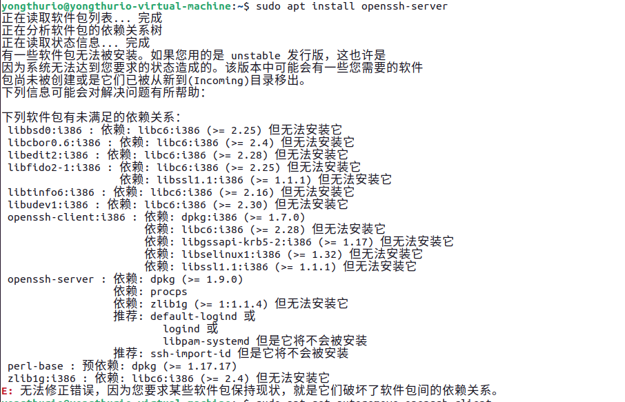 使用命令sudo apt install openssh-server进行安装,报错: