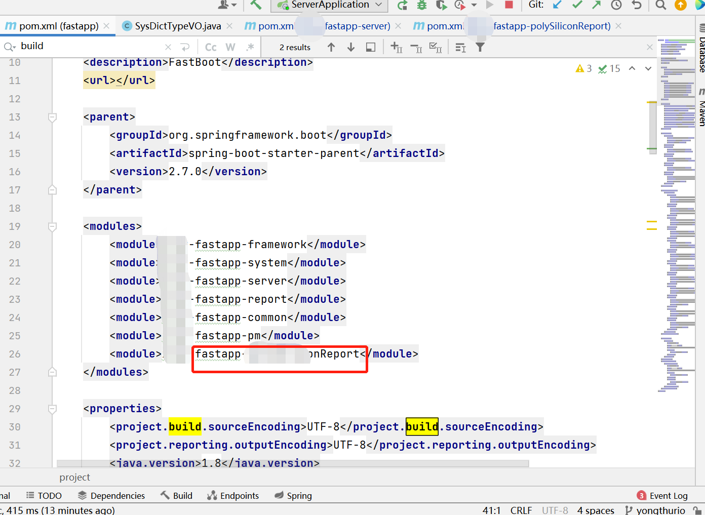 这时候去pom文件里面看是否将那个module包含进去了
