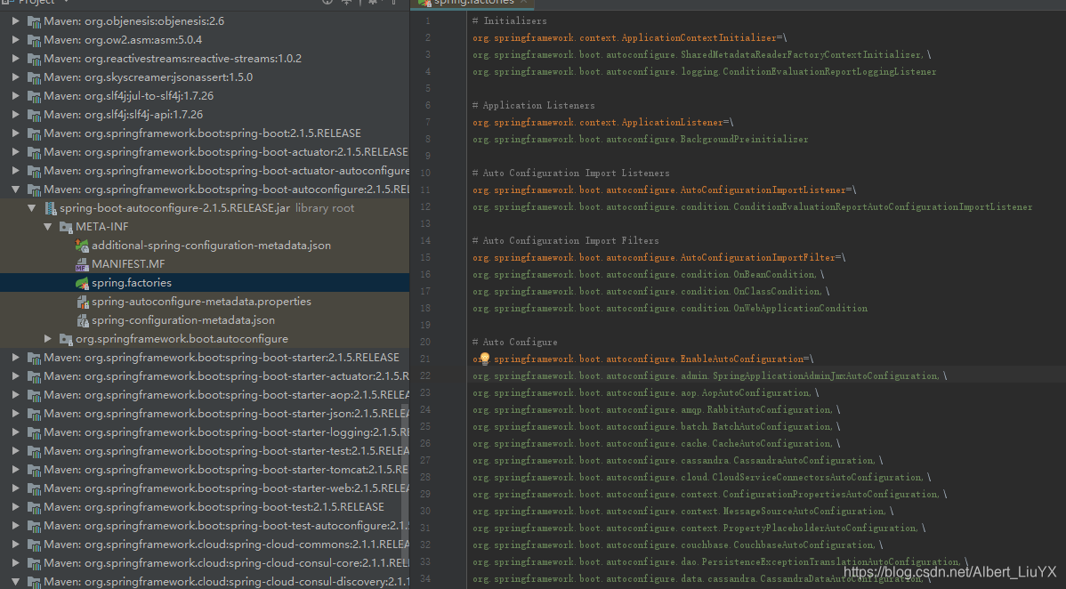可见 最后由 SpringFactoriesLoader将META-INF/spring.factories 文件加载解析