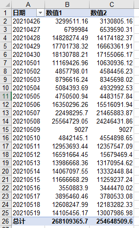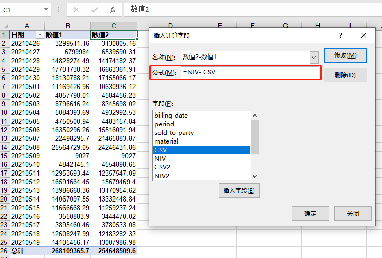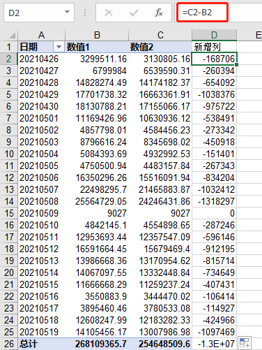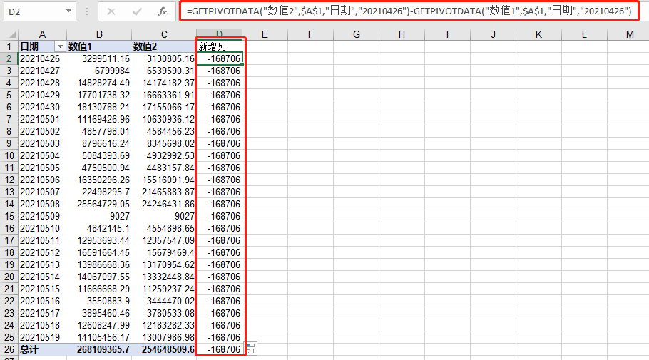 有这么一张数据透视表,如下所示,我们需要新增一列,新增列的值为数值2减去数值1的值: