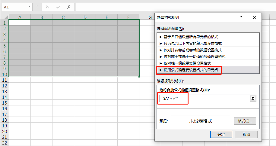 2、依次点击“开始”->“条件格式”->“新建规则”,选择“使用公式确定要设置格式的单元格”,输入公式=$A1<>"",判断单元格是否为空值;<>表示不等号,""表示空值,公式表示的意思是当单元格不等于空值时设置单元格格式。简单的说就是当单元格中有内容的时,自动添加格式。