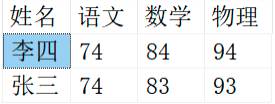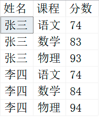 IF OBJECT_ID('Score') IS NOT NULL DROP TABLE Score GO CREATE TABLE Score (姓名 NVARCHAR(10),课程 NVARCHAR(10),分数 INT); INSERT INTO Score VALUES(N'张三',N'语文',74) INSERT INTO Score VALUES(N'张三',N'数学',83) INSERT INTO Score VALUES(N'张三',N'物理',93) INSERT INTO Score VALUES(N'李四',N'语文',74) INSERT INTO Score VALUES(N'李四',N'数学',84) INSERT INTO Score VALUES(N'李四',N'物理',94) GO SELECT * FROM Score GO