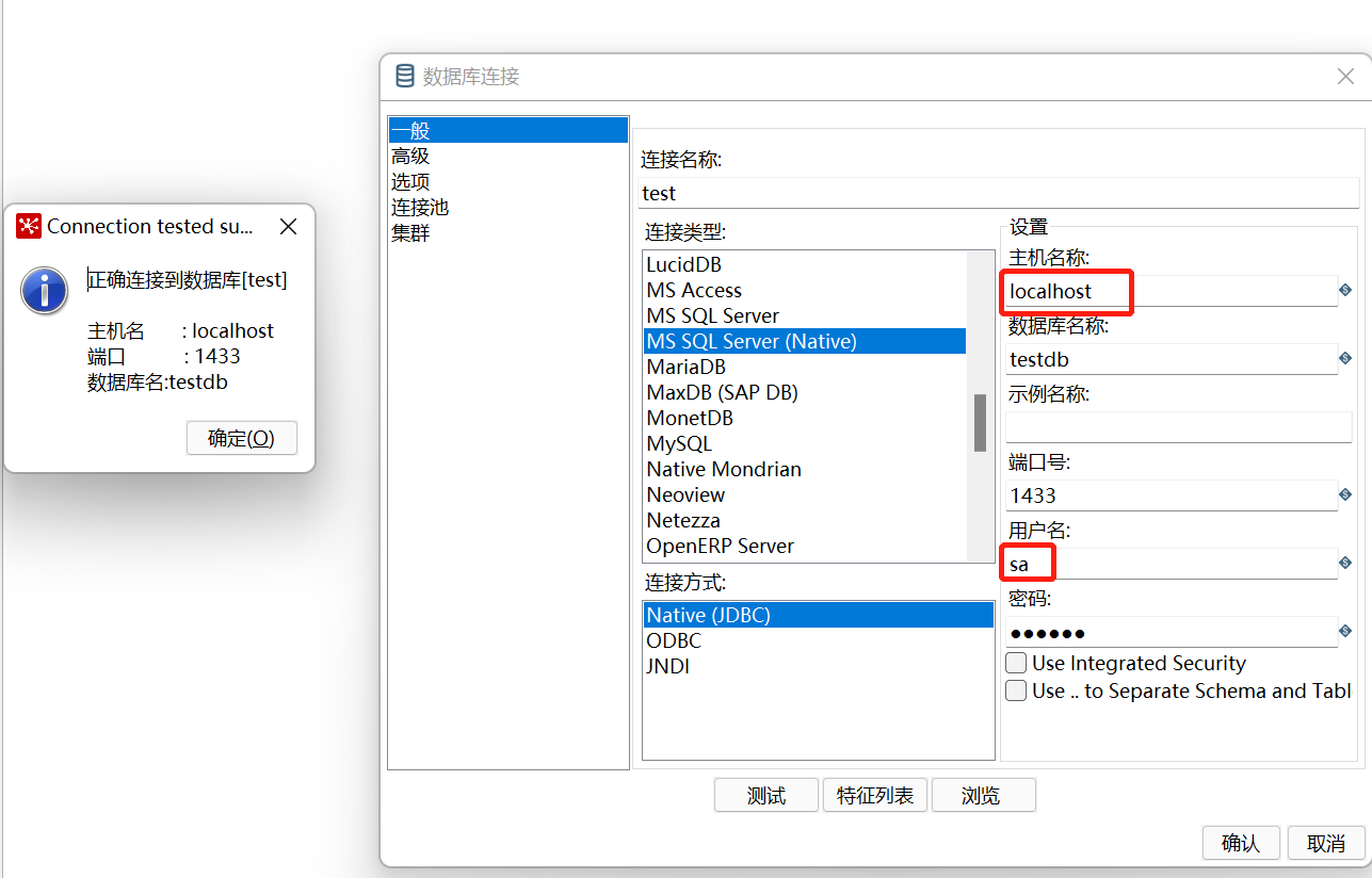 1.3 重启Spoon.bat,测试连接SQL Server数据库,如下(此处以连接本地主机为例)
