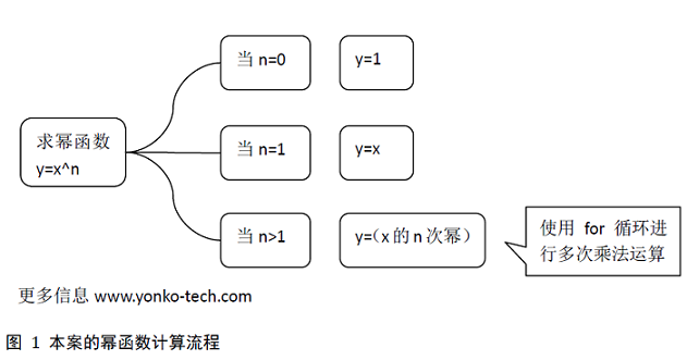 当n>1时,x^n=x*x…,就是把n个x相乘。这样就可以得到本案中的幂函数的计算流程如图 1。