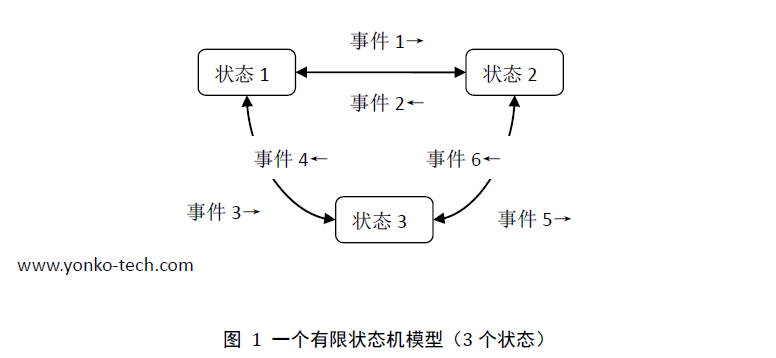 状态机有几个要素:状态,条件,动作和下个状态,在某个状态时在某种条件(事件)下才会执行某个动作跳转到下一个状态,其中动作不是必需的。如图 1为一个3元有限状态机的模型,它有着3个状态,触发状态切换的事件最多有6个。当机器处于状态1时,只有发生了事件1才会切换到状态2,同样,在状态2时只有发生了事件2才会切换到状态1,其余的状态切换流程以此类推。在某一个状态,你可以根据需求定义机器的参数,例如温度达到多少、流量是多少等,在状态机内部再根据控制算法执行相应的动作调整机器的参数。