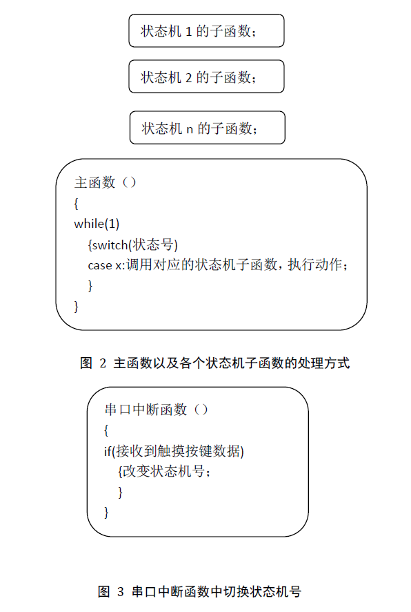 最近在做工控、电路板、单片机、仪器、软件开发定制项目(业务Q:2531-2637-26)的时候,用到一个串口触摸屏作为人机交互接口,在这个屏上会做很多界面来用于参数的设置和显示。这时,我就把每个界面当作状态机的一个状态来处理,每个界面上的触摸按键反馈的信号就是状态机的事件,一旦接收到相应的触摸按键的信号(事件),屏的界面就会根据跳转逻辑发生跳转并根据指令控制执行器执行相应的动作。由于是串口触摸屏并用单片机作为的处理器,每个界面(状态)的显示、动作的执行等功能我编写成一个一个的子函数,并在主函数中的while(1)循环中根据状态号来调用,对于触摸按键信号的接收和状态号的切换跳转等简短的指令我在串口中断函数中处理,这样做的好处是让程序结构清晰,又节省了中断程序的执行时间避免中断丢失。