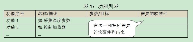 在实施的时候对于功能硬件可以根据第4节中介绍的功能列表,把每个功能需要的软硬件一一对应列出来,如下: