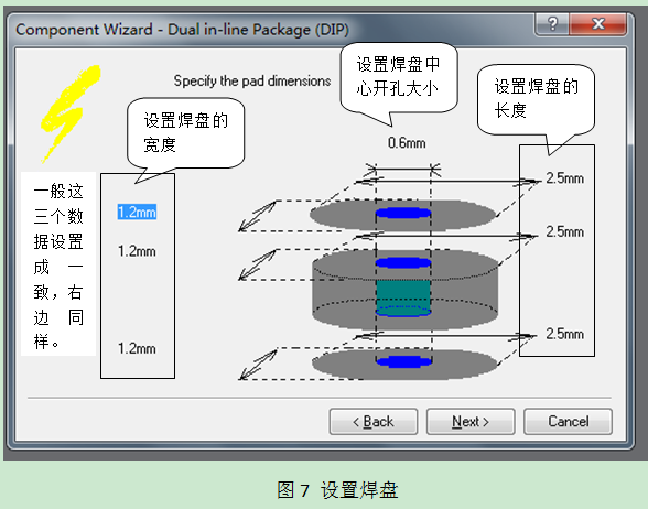 设置焊盘信息:包括开孔(DIP有开孔,SOP等表面贴是没有开孔的。开孔一般比DIP元件的引脚要大点点才好安装)、焊盘尺寸等。完成后点next。
