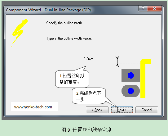 设置丝印线条宽度:丝印层是用在电路板上作标识的文字和图案的图层,它不参与电路,但是也是必要的。这一步是设置丝印线条的宽度,完成后点击next。