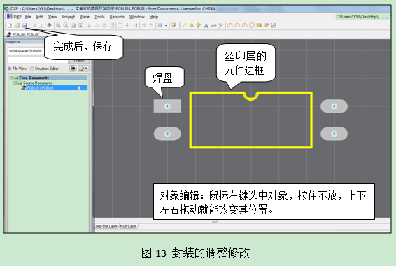 调整修改:新建PCB元件完成之后还是可以对其进行编辑的,方法是用鼠标左键选中要修改的对象(如焊盘、丝印的线条等),按住不放,上下左右拖动就能改变对象的位置。