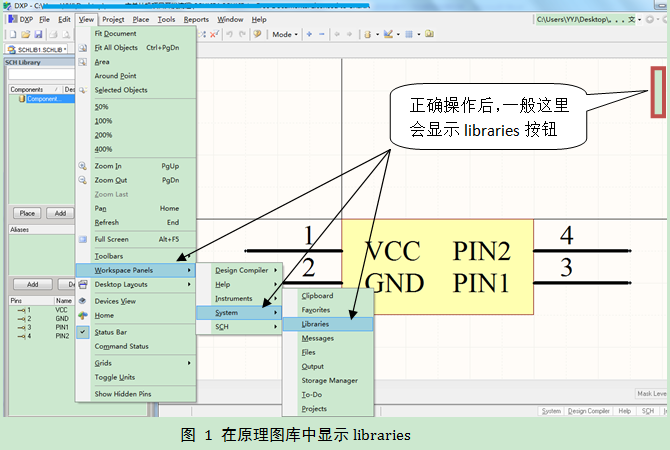 先显示libraries:打开原理图库文件,先看看右边有没有libraries这个按钮,如果没有,那么依次点击上方菜单栏view→workspace panel→system→libraries,一般右侧就有显示了。