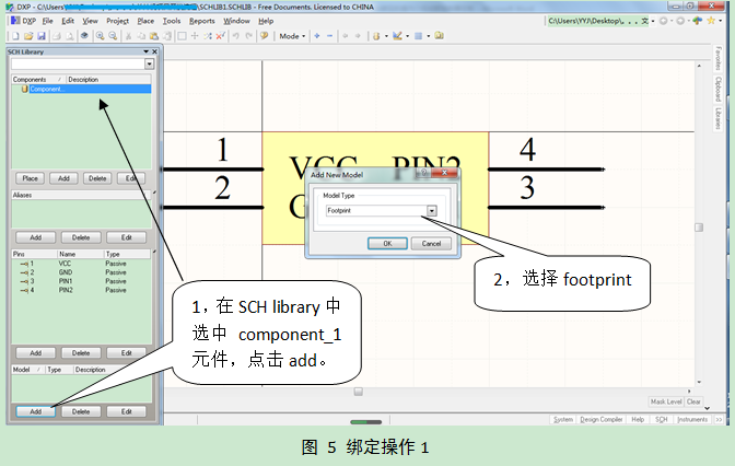 ●绑定。加载好库后,接着就可以将该原理图库中的component_1和封装进行绑定了。