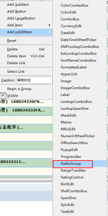 但它实际上是一个TcxBarEditItem!只是它的properites属性设置成了cxRadioGroup!所以你不能把它当成一个cxRadioGroup来看待.否则你就会发现,它没有cxRadioGroup所应该具有的方法和属性.