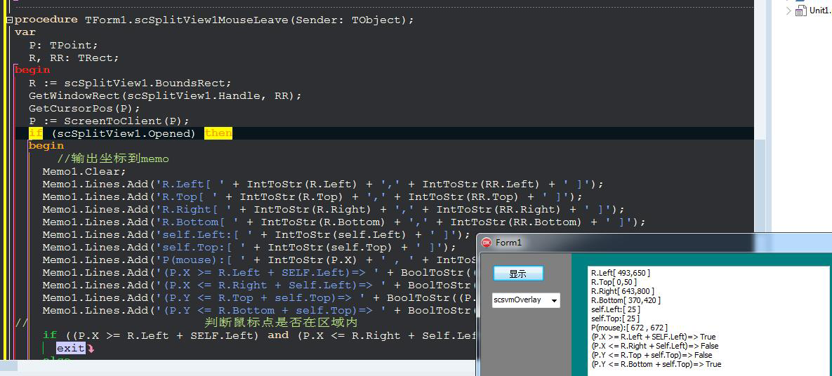 这个BoundsRect 是不是应该这么理解 ? 天天写bug 2022-11-02 19:13:25 我是想判断鼠标有没有在指定区域内,但是一直没能得到预想的效果 delphi入门爱好者 2022-11-02 19:47:27 错了 天天写bug 2022-11-02 19:49:13 想做一个温柔的人 错了 @delphi入门爱好者 我已经知道错了,但还是没理解 ..我刚刚是用GetWindowRect(scSplitView1.Handle, R);拿 到的数据 做的对比 ,发现数据根本不一样 delphi入门爱好者 2022-11-02 19:49:36