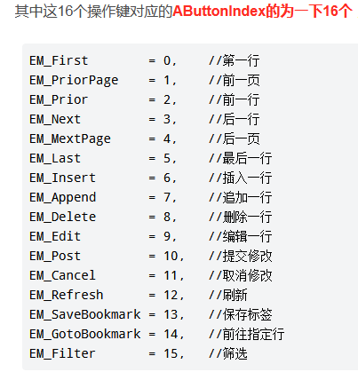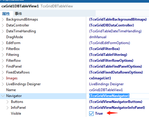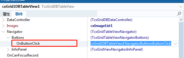 procedure TForm1.cxGrid1DBTableView1NavigatorButtonsButtonClick(Sender: TObject;AButtonIndex: Integer; var ADone: Boolean); begin case AButtonIndex of //AButtonIndex: 不管是自带的还是自定义的按钮,每个按钮都有自己的索引值 8: //自带按钮,有默认事件 begin ADone := True; //禁止执行默认事件,相当于重写事件 //你的业务代码,这里建议函数调用,而不是直接在这里写代码 end; 18: //自定义按钮,没有默认事件 begin //你的业务代码,这里建议函数调用,而不是直接在这里写代码 end; end; end;