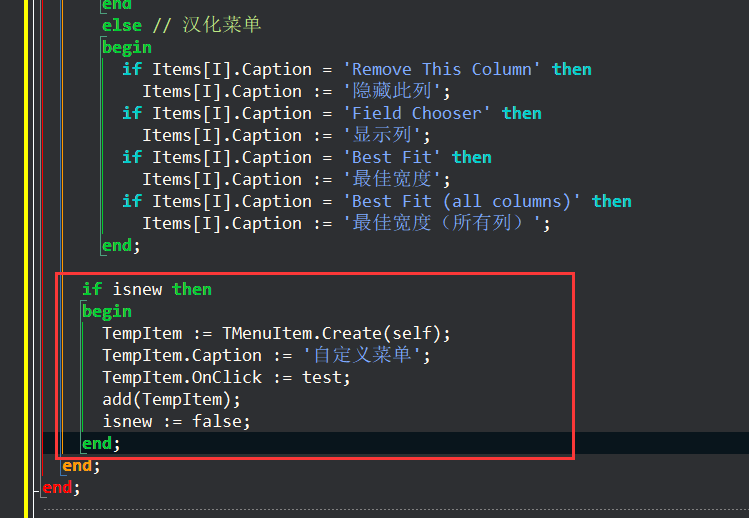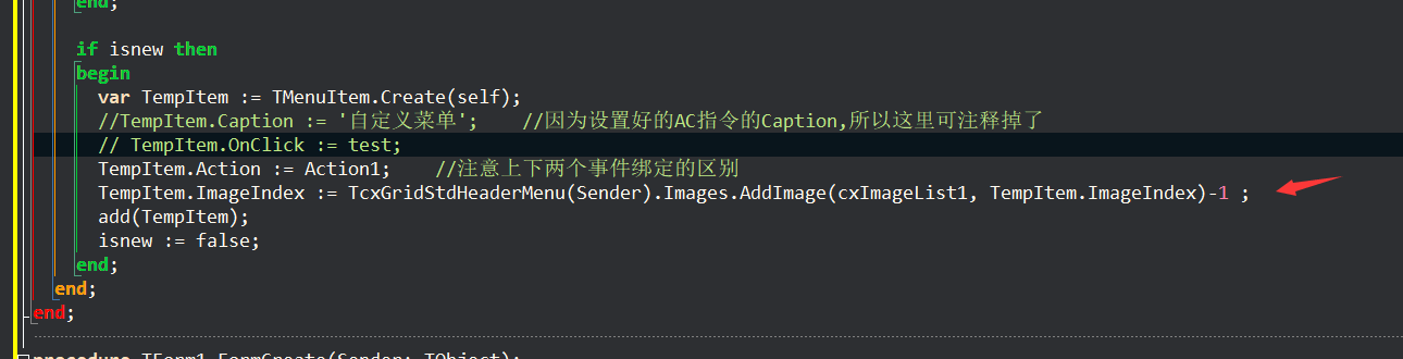 if isnew then begin TempItem := TMenuItem.Create(self); //TempItem.Caption := '自定义菜单'; //因为设置好的AC指令的Caption,所以这里可注释掉了 // TempItem.OnClick := test; TempItem.Action := Action1; //注意上下两个事件绑定的区别 add(TempItem); isnew := false; end; end;