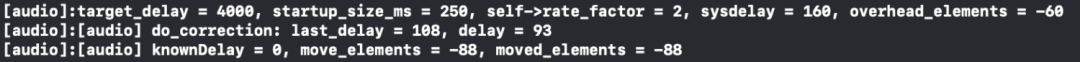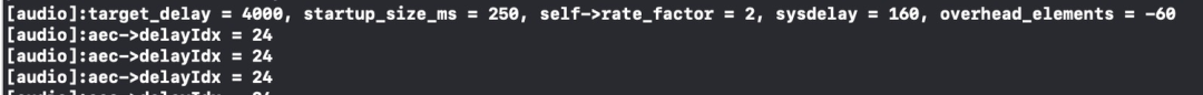 如果设置默认延时为 240ms,overhead_elements 第一次被调整了 -60 个 block,负值表示向前查找,正好为 60 * 4 = 240ms,之后线性滤波器固定 index = 24,表示 24 * 4 = 96ms 延时,二者之和约等于 330ms。日志打印如下: