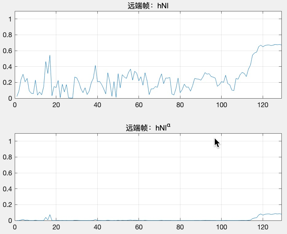如果当前帧为远端帧(即 echo_state = true),假设第 k 个频带 hNl(k) = 0.6676 ,hNl(k) = hNl(k)^α = 0.6676 ^ 30 = 5.4386e-06,滤波后远端能量小到基本听不到了。如图 8(b),hNl 经过 α 调制之后,基本接近 0。