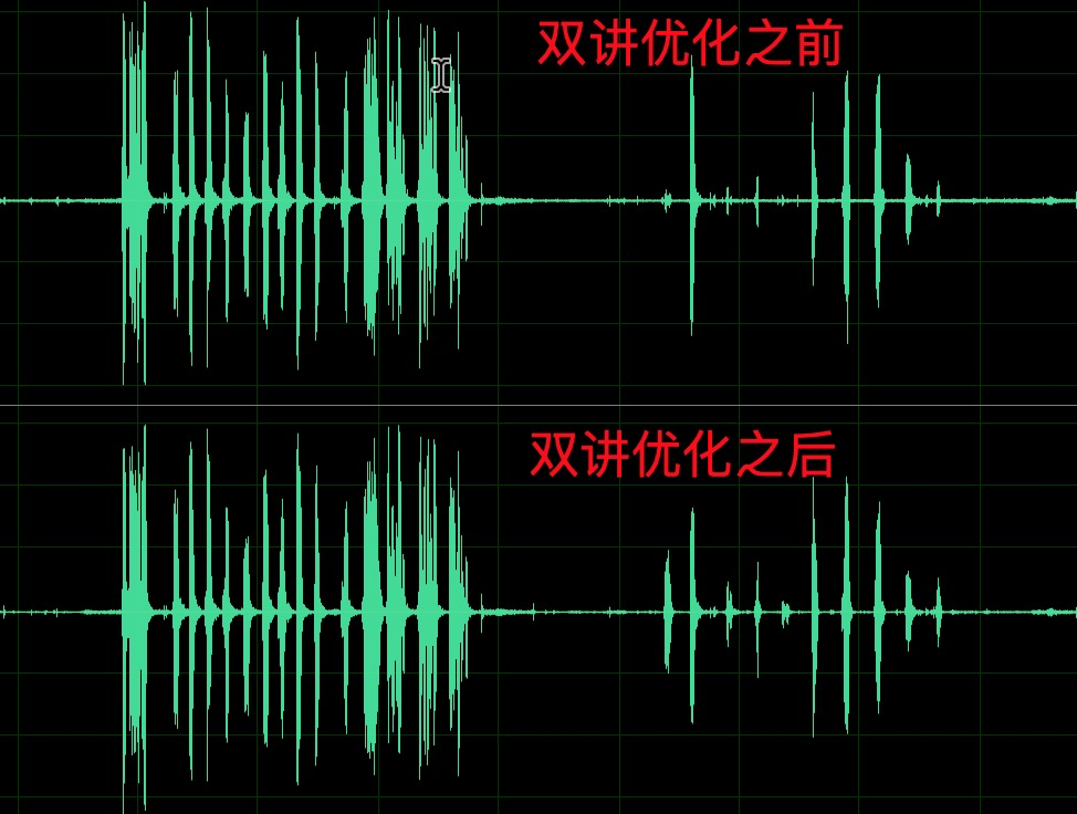 另外,调整系数 α 过于严格的情况下会带来双讲的抑制,如图 9 第 1 行,近端说话人声音明显丢失,通过调整 α 后得以恢复,如第 2 行所示。因此如果在 WebRTC AEC 现有策略上优化 α 估计,可以缓解双讲抑制严重的问题。