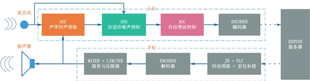 图 1 WebRTC 中音频信号上下行处理流程框图
