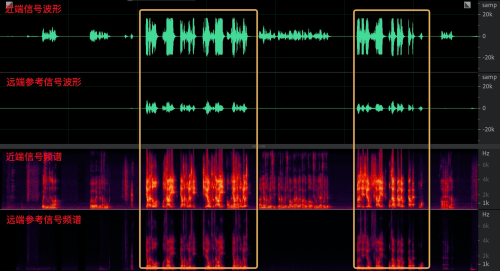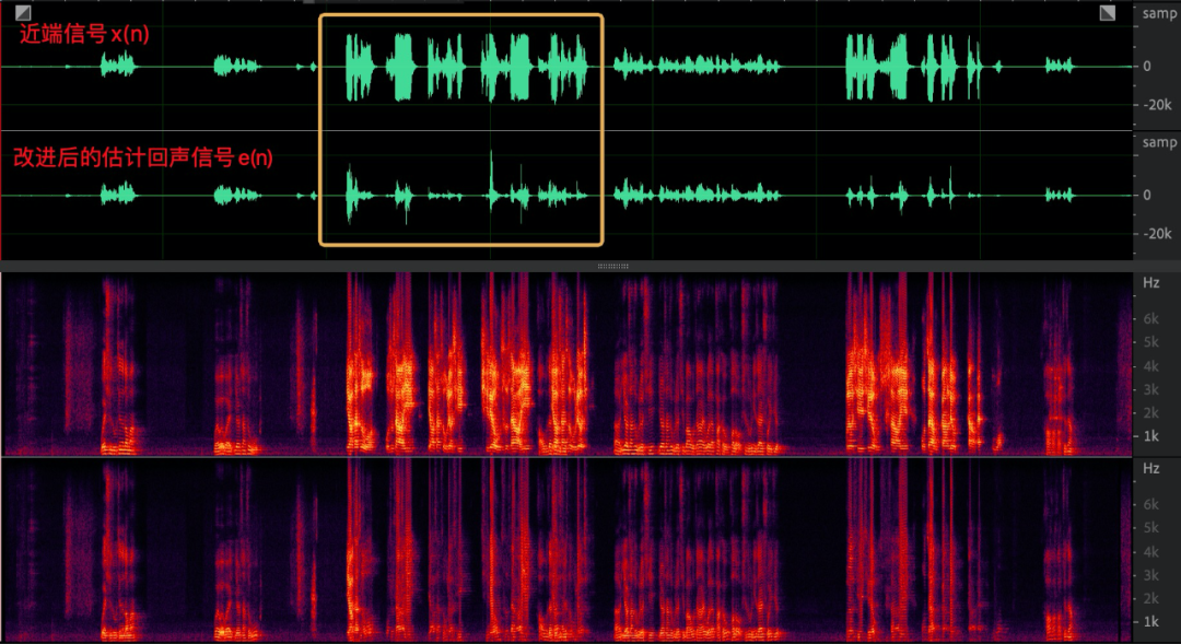 这里我们对比了现有的固定步长的 NLMS 和变步长的 NLMS,近端信号 d(n) 为加混响的远端参考信号 x(n) + 近端语音信号 s(n)。理论上 NLMS 在处理这种纯线性叠加的信号时,可以不用非线性部分出马,直接干掉远端回声信号。图 7(a) 第一行为近端信号 d(n),第二列为远端参考信号 x(n),线性部分输出结果,黄色框中为远端信号。WebRTC AEC 中采用固定步长的 NLMS 算法收敛较慢,有些许回声残留。但是变步长的 NLMS 收敛较快,回声抑制相对好一些,如图 7(b)。