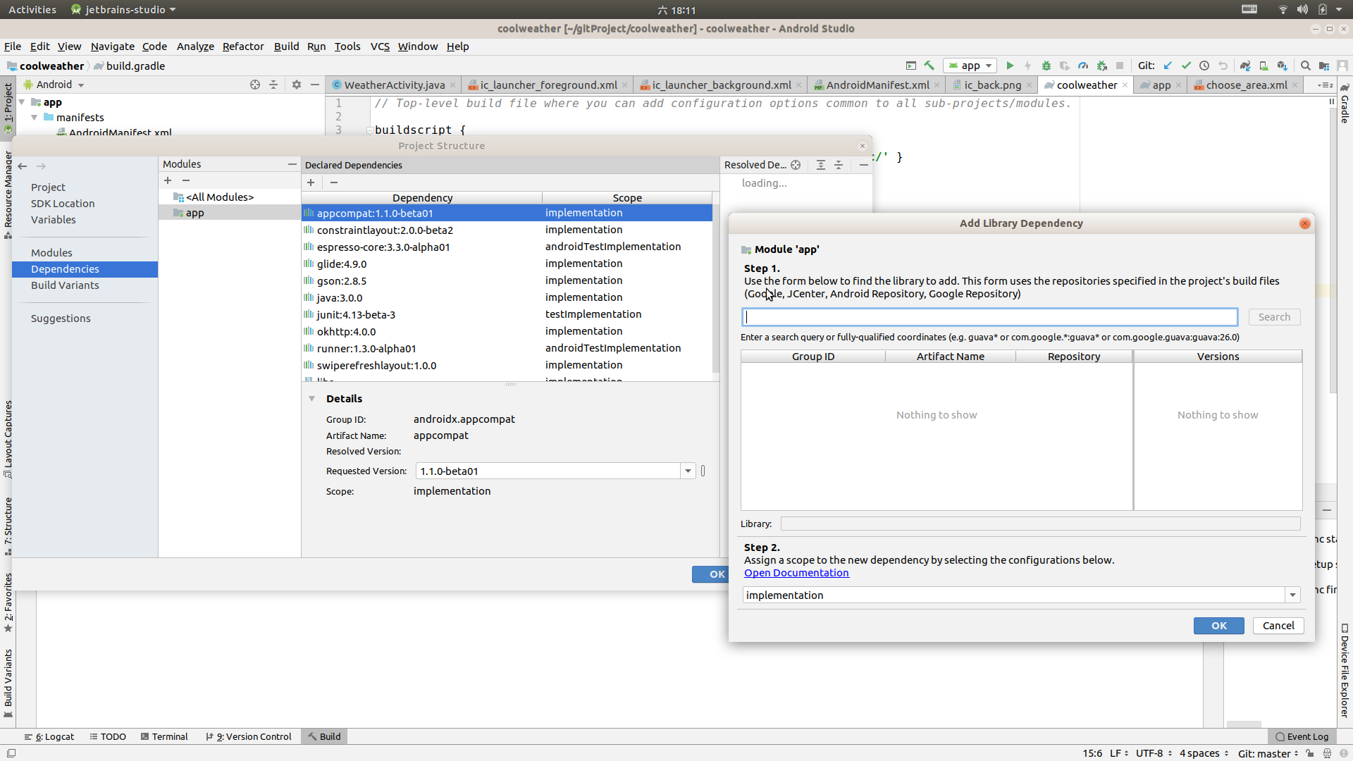 注意:如果google源速度太慢,可以使用阿里云镜像仓库,只需在build.gradle(Project:coolweather)里面添加阿里云仓库地址
