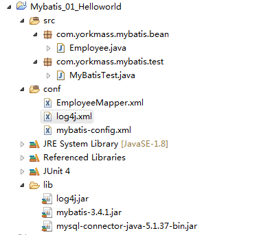1、新建一个java工程,新建lib文件夹,导入相关jar包,mybatis-3.4.1.jar、mysql-connector-java-5.1.37-bin.jar、log4j.jar(log4j包为了查看日志方便才导入的)
