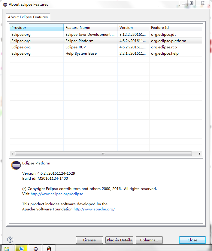 下载spring-tool-suite-3.8.3.RELEASE-e4.6.2-win32文件,这个需要安装在eclipse上面,所以必须要选择和eclipse相对应的版本安装,如何查看eclipse版本号?我们打开eclipse,help-About Eclipse,点击第一个eclipse图标,可以看到eclipse Platform的版本号。